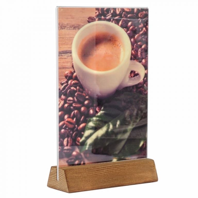 Alege Menu Holder WOOD, un suport pentru pliante, meniuri, flyere, din plexiglas transparent si cu baza din lemn de brad maro deschis. Insertul pentru print este de tip U realizat din plexiglas transparent cu grosimea de 2 mm. Dimensiuni disponibile pentru formatele standard A4 si A5.