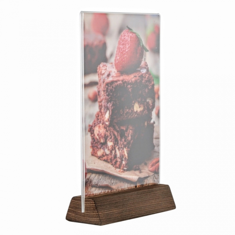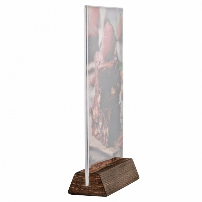 Alege Menu Holder WOOD, un suport pentru pliante, meniuri, flyere, din plexiglas transparent si cu baza din lemn de brad baituita maro inchis. Insertul pentru print este de tip U realizat din plexiglas transparent cu grosimea de 2 mm. Dimensiuni disponibile pentru formatele standard A4 si A5.