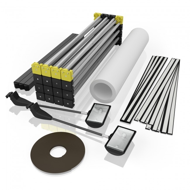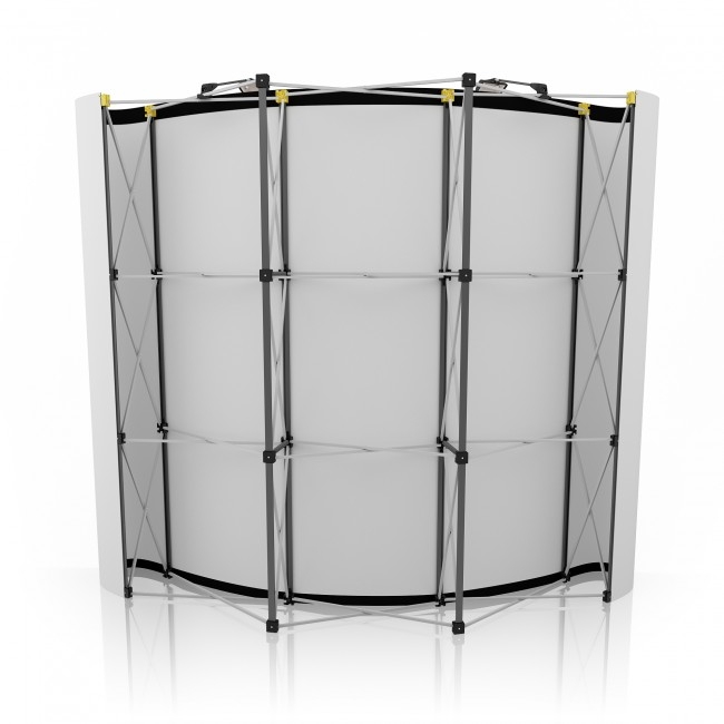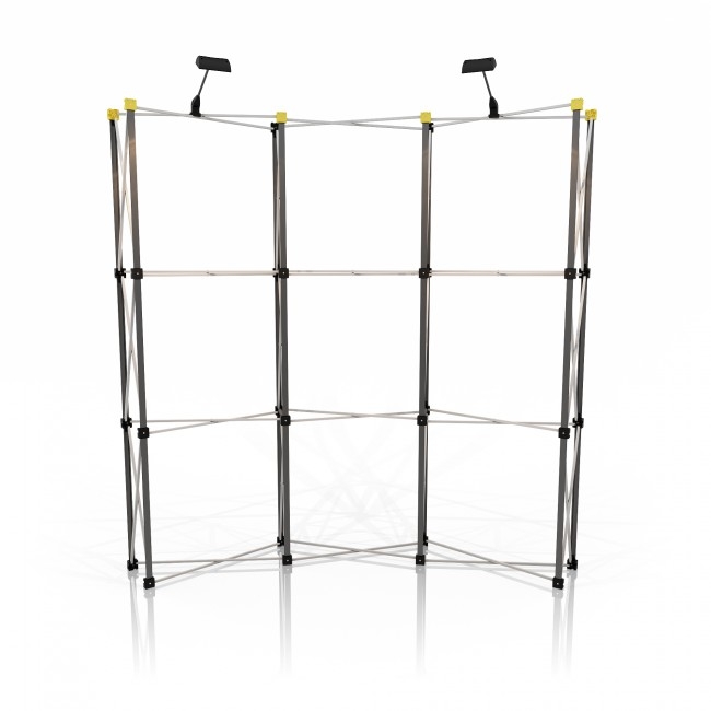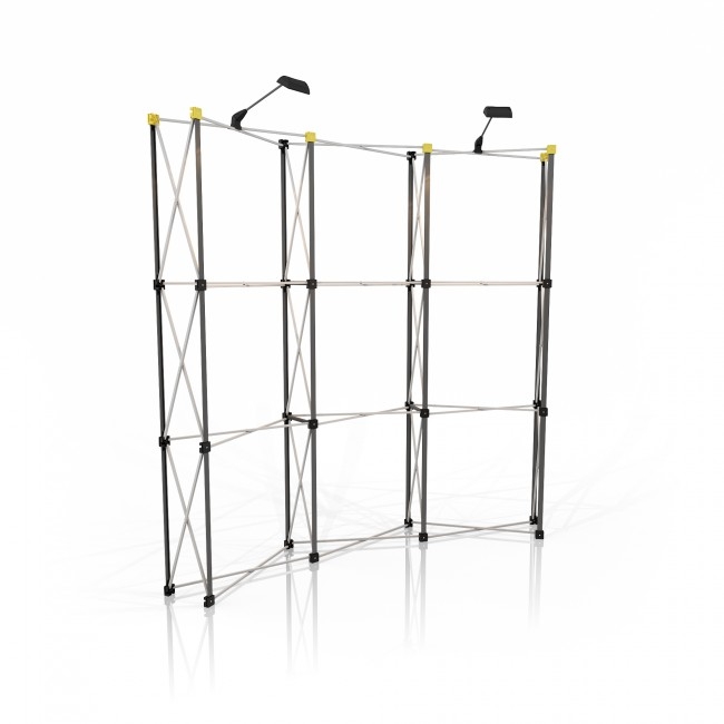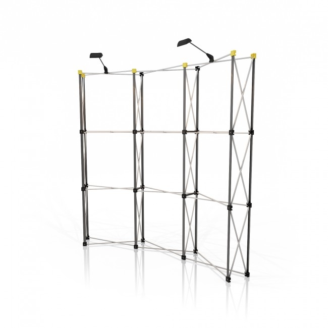 Sistemul extensibil Pop-up, 18 tijele vericale, banda magnetica, 5 hangere din PVC, 2 spoturi luminoase 50W, geanta de transport. |